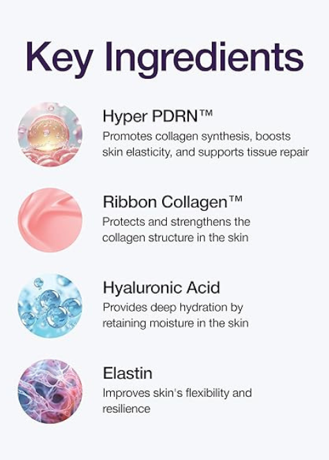 U središtu formule nalazi se PDRN, poznat po regenerativnom djelovanju koje pomaže obnoviti kožu i ojačati njezinu strukturu. Kombinacija Hyper PDRN™ i Ribbon Collagen™ pomaže poboljšati elastičnost i pružiti vidljiv 3D lifting efekt, dok kolagen i elastin doprinose zaglađenijem i punijem izgledu kože.
