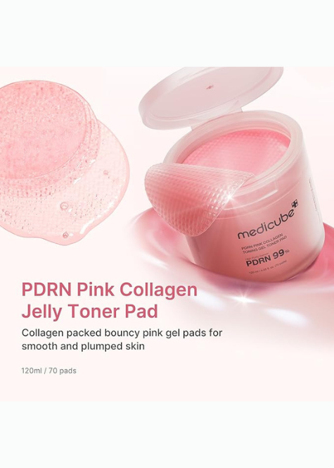 Medicube PDRN Pink Collagen Toning Gel Toner Pad su  gel toner jastučići koji u jednom koraku hidriraju, toniraju, zaglađuju teksturu i vraćaju koži plump i glow izgled.
