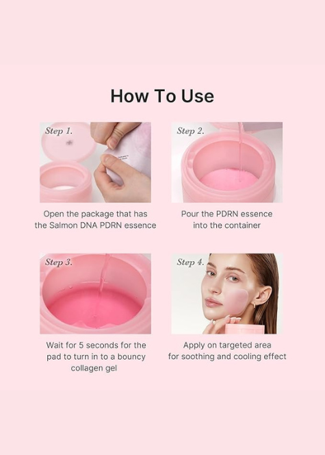 Svaki ultra-mekani gel pad natopljen je esencijom sa Salmon PDRN-om, kolagenom i hidratantnim kompleksima koji pomažu obnoviti kožu, poboljšati elastičnost i ojačati kožnu barijeru. Ružičasta “jelly” tekstura savršeno prianja uz kožu, hladi, smiruje i ostavlja lice svježe, glatko i blistavo.
